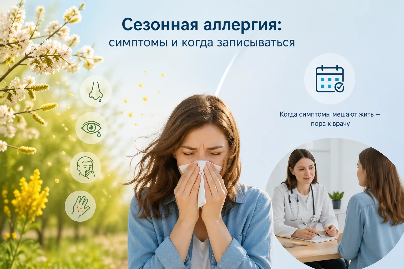 Записаться имеет смысл, если симптомы повторяются каждый сезон, мешают работе/учёбе или если вы не уверены, чем именно они вызваны. Часто консультация нужна не “в самый пик”, а когда есть время спокойно выстроить план на сезон.